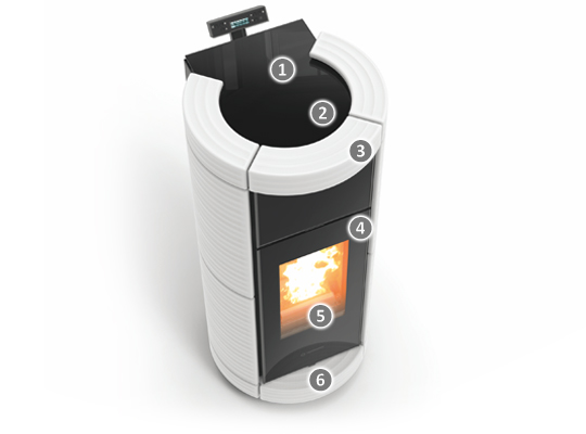 1 – Plano igiénico en cristal2 – Carga de pellet a través de tapa retráctil3 – Preciosas mayólicas hechas a mano4 – Puerta en cristal serigrafiado y fundición5 – Quemador patentado Pelletpower®6 – Plano para recoger las cenizas en mayólicas