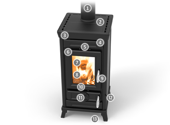 La forma racional y el diseño esencial caracterizan a esta estufa como un producto único por su economía y elegancia. La tecnología innovadora SMOKE BY PASS reduce drásticamente la salida de humo en el hogar, antes de cada carga de leña.